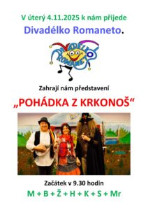 V úterý 4.11.2025 k nám přijede Divadélko Romaneto. Zahrají nám představení „POHÁDKA Z KRKONOŠ“ Začátek v 9.30 hodin M + B + Ž + H + K + S + Mr...