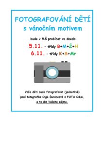 bude v MŠ probíhat ve dnech: bude v MŠ probíhat ve dnech: 5.11. – třídy B+M+Ž+H 6.11. – třídy K+S+Mr Vaše děti bude fotografovat (jednotlivě) paní fotografka Olga...