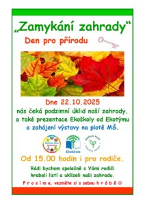 Dne 22.10.2025 nás čeká podzimní úklid naší zahrady, a také prezentace Ekoškoly od Ekotýmu a zahájení výstavy na plotě MŠ. Od 15.00 hodin i pro rodiče. Rádi...