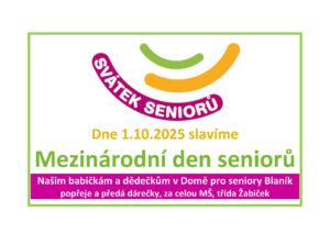 Dne 1.10.2025 slavíme Mezinárodní den seniorů Našim babičkám a dědečkům v Domě pro seniory Blaník popřeje a předá dárečky, za celou MŠ, třída Žabiček