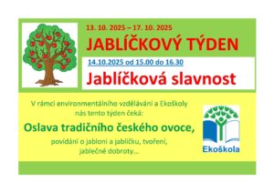 13. 10. 2025 – 17. 10. 2025 – JABLÍČKOVÝ TÝDEN Jablíčková slavnost – 14.10.2025 od 15.00 do 16.30 V rámci environmentálního vzdělávání a Ekoškoly nás tento týden čeká: Oslava tradičního...