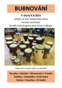 V úterý 9. 9. 2025 přijede se svou bubenickou show Jaroslav Suchánek. Na děti čeká program plný rytmu a zábavy. Bubnovat se bude venku na zahradě. Berušky...