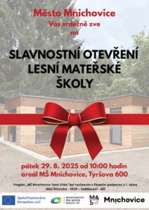 Město Mnichovice Vás srdečně zve na slavnostní otevření lesní mateřské školy. pátek 29. 8. 2025 od 10:00 hodin, areál MŠ Mnichovice, Tyršova 600.