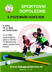 V úterý 16. 9. 2025 od 10:00 hodin si na hřišti zasportujeme spolu s trenéry TJ Mnichovice oddílu pozemního hokeje.