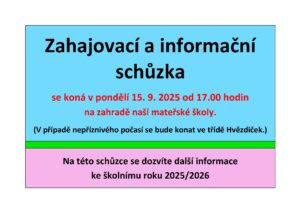 se koná v pondělí 15. 9. 2025 od 17.00 hodin na zahradě naší mateřské školy. (V případě nepříznivého počasí se bude konat ve třídě Hvězdiček.) Na této schůzce se dozvíte...