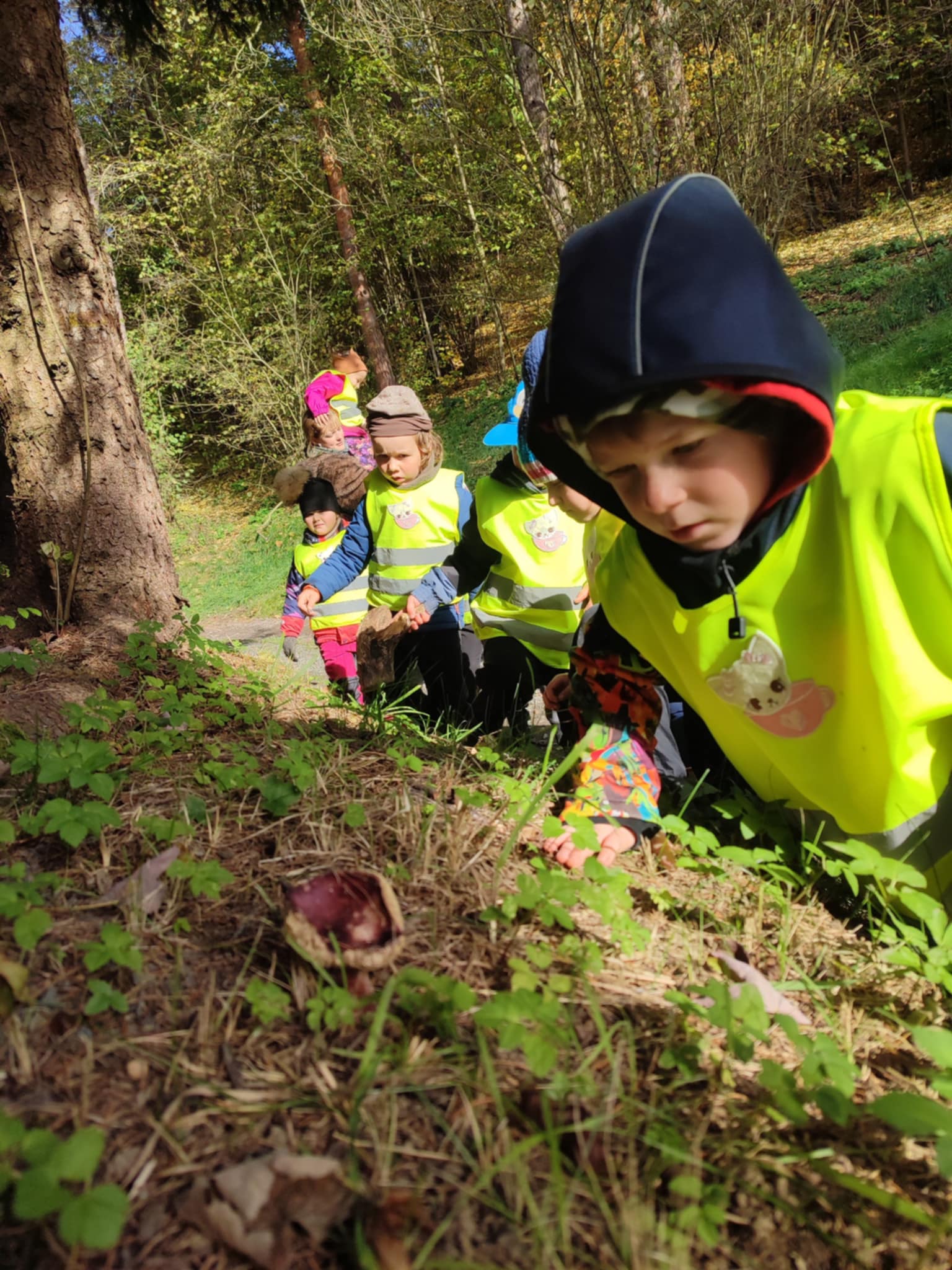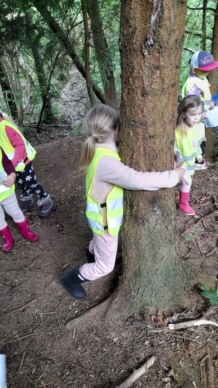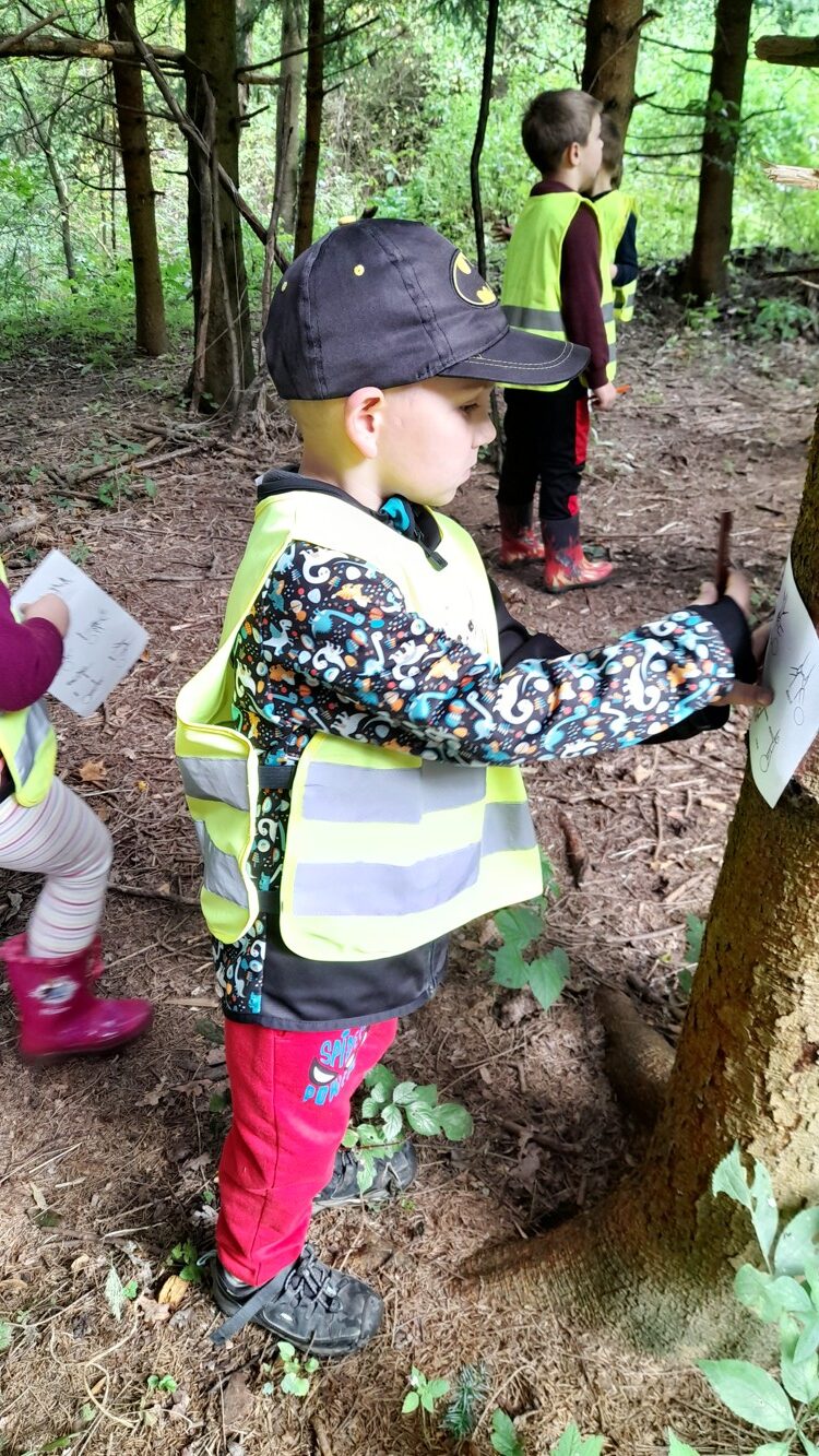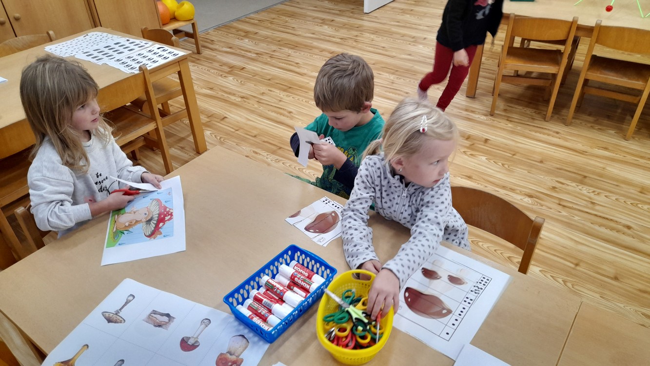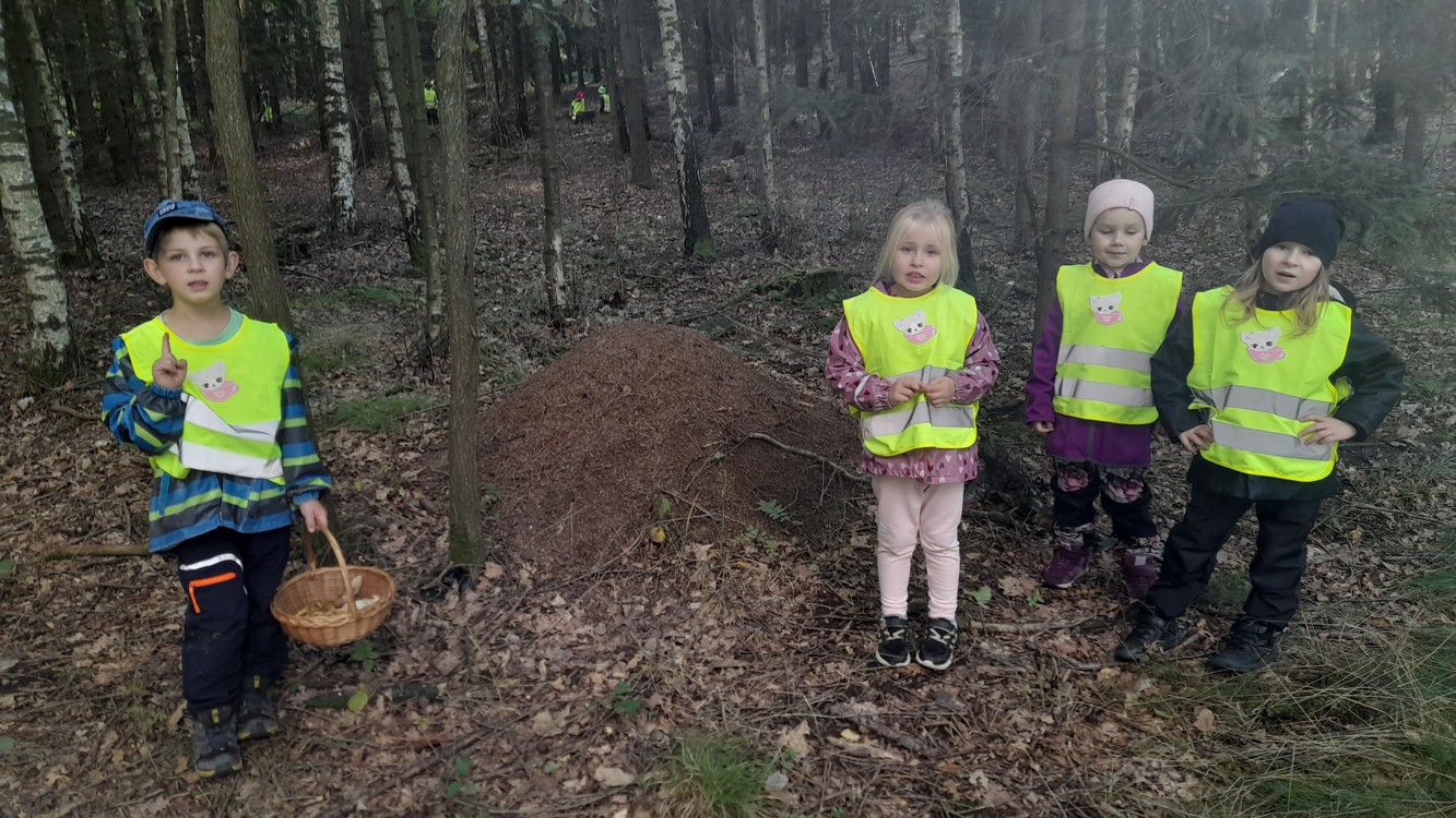 Během září a října jsme využili krásného počasí a vydali se do lesa bádat. Nejprve jsme poslouchali, co všechno v lese slyšíme a vidíme, poznávali různé zvuky a pátrali po stopách zvířátek, které jsme našli. Děti hádaly, komu mohou nalezené stopy patřit. Poté si zkusily změřit, jak je který strom tlustý a zahrály si hru na stromové chňapáky a podle obrázku hledaly různé druhy stromů – malé, velké, hubené i tlusté. Nakonec jsme se pustili do hledání hub, učili jsme se rozlišovat, které jsou jedle a nejedlé. Děti se naučily vnímat přírodu všemi smysly a užily si den plný objevování a dobrodružství v kouzelném lese.