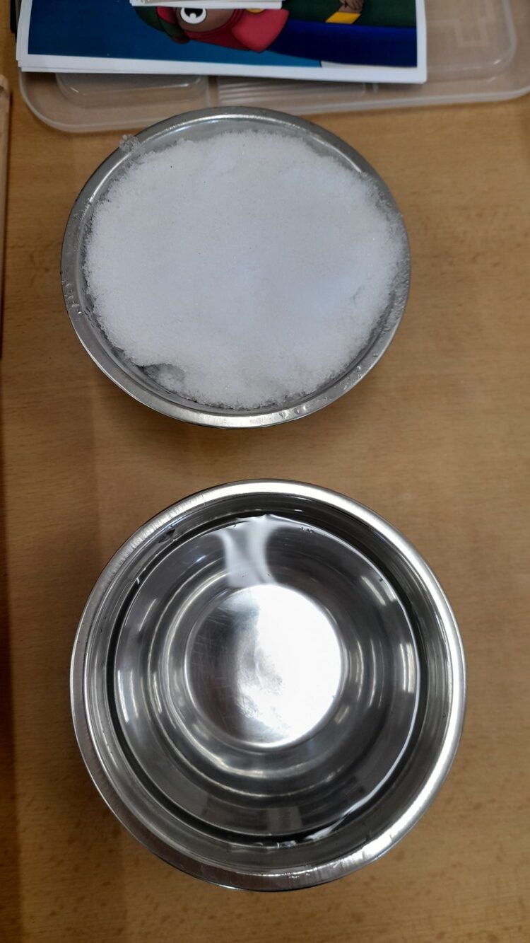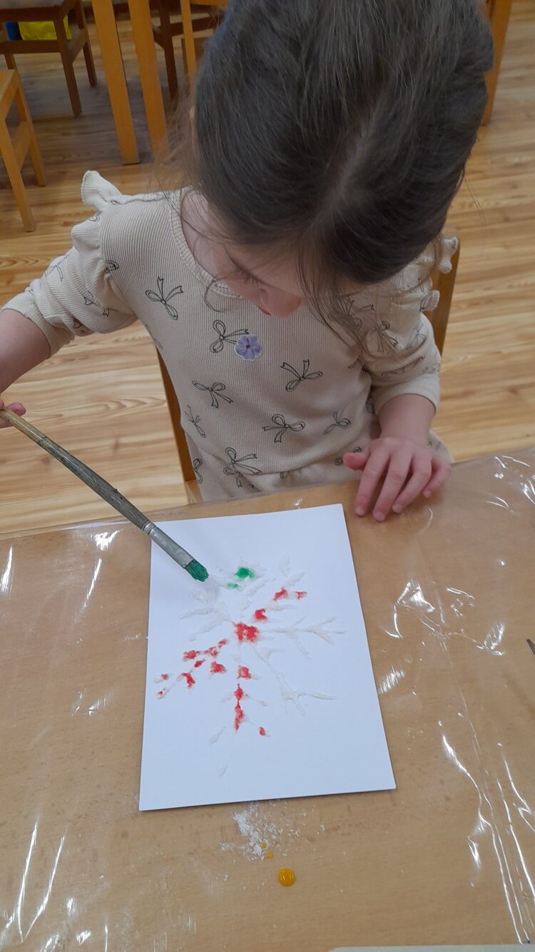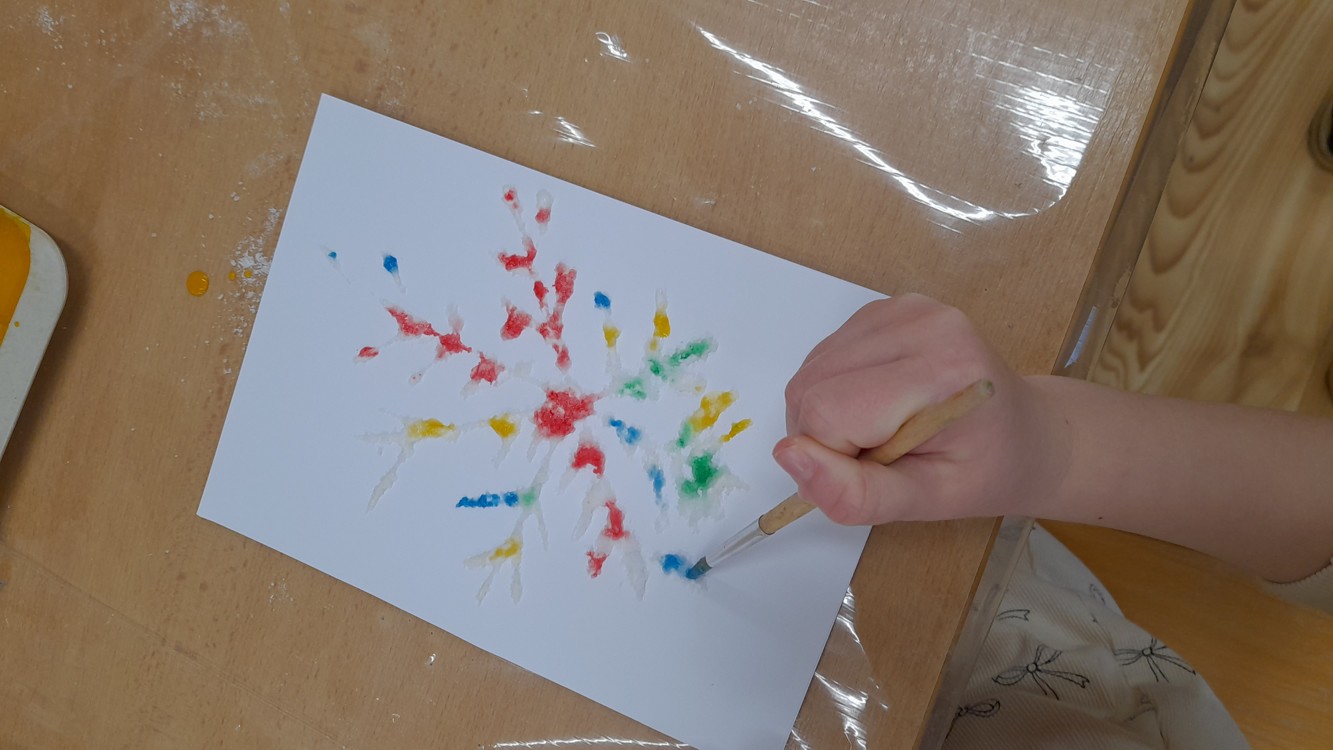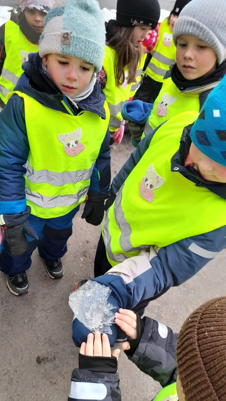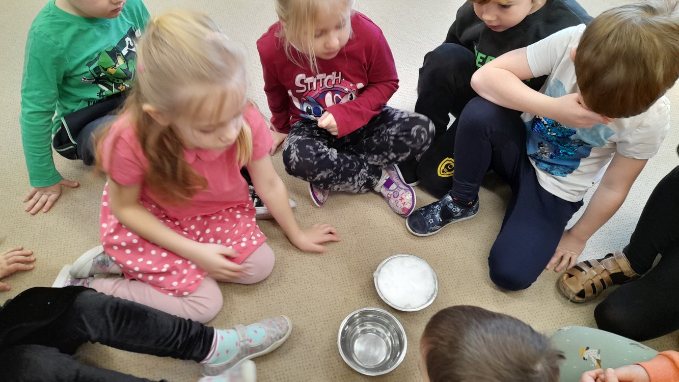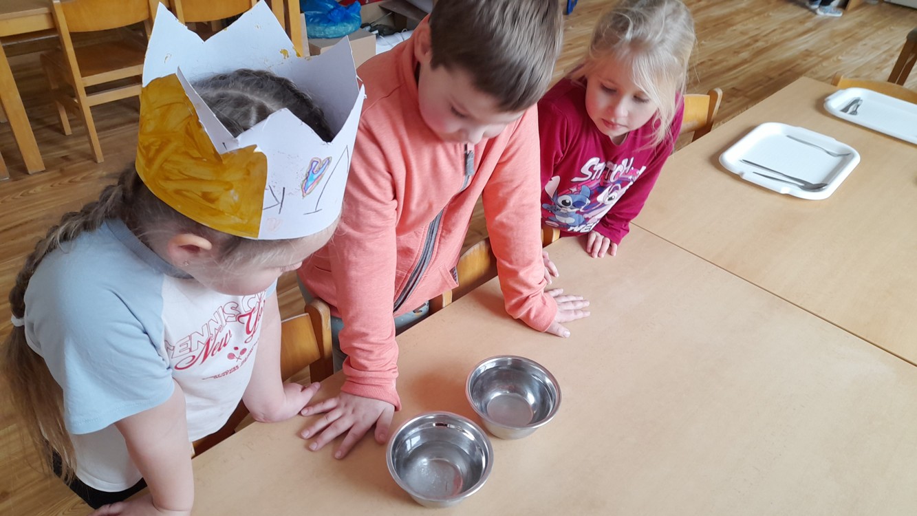 Děti zkoumaly nasbíraný sníh – po jeho roztání pozorovaly, co v něm zůstalo a porovnávaly množství vody z roztátého sněhu s miskou vody. Venku v mrazu jsme vyzkoušeli foukání bublin, na kterých se tvořily ledové krystaly. Na závěr si děti vytvořily třpytivé 3D sněhové vločky.