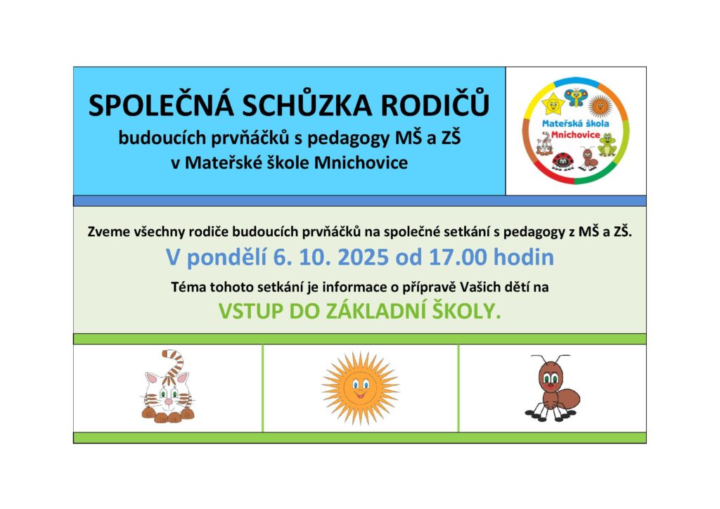 Zveme všechny rodiče budoucích prvňáčků na společné setkání s pedagogy z MŠ a ZŠ.